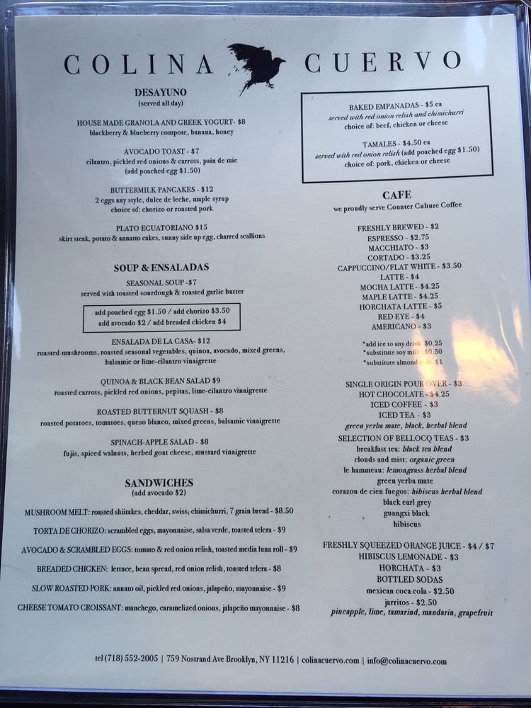 Colina Cuervo, a Latin American cafe located in Brooklyn, NY, offers a diverse menu with vegan options and a cozy atmosphere. With a range of cold and hot beverages, including unique options like horchata lattes and chamomile lemongrass blended iced tea, Colina Cuervo provides a refreshing experience for all tastes. Customer reviews highlight the delicious dishes such as chorizo torta, tamales, and the popular pancakes with caramel butter. Although there are mentions of inconsistency in taste, the overall dining experience is praised for friendly service and a cute, clean ambiance. Colina Cuervo stands out as an underrated gem for breakfast, brunch, and lunch options, making it a must-visit spot for those looking for a delightful culinary experience.